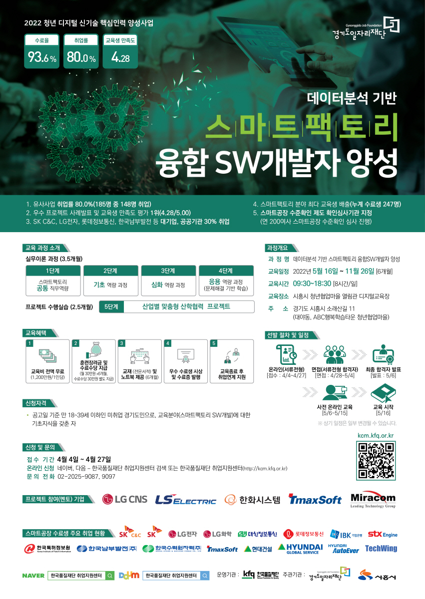 2022년 청년 디지털신기술 핵심인력 양성사업(스마트팩토리 SW 융합 개발자 양성과정)에 관심있는 여러분들의 많은 지원을 바랍니다.