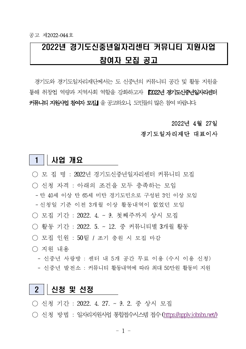 2022년 경기도신중년일자리센터 커뮤니티 지원사업 모집 공고