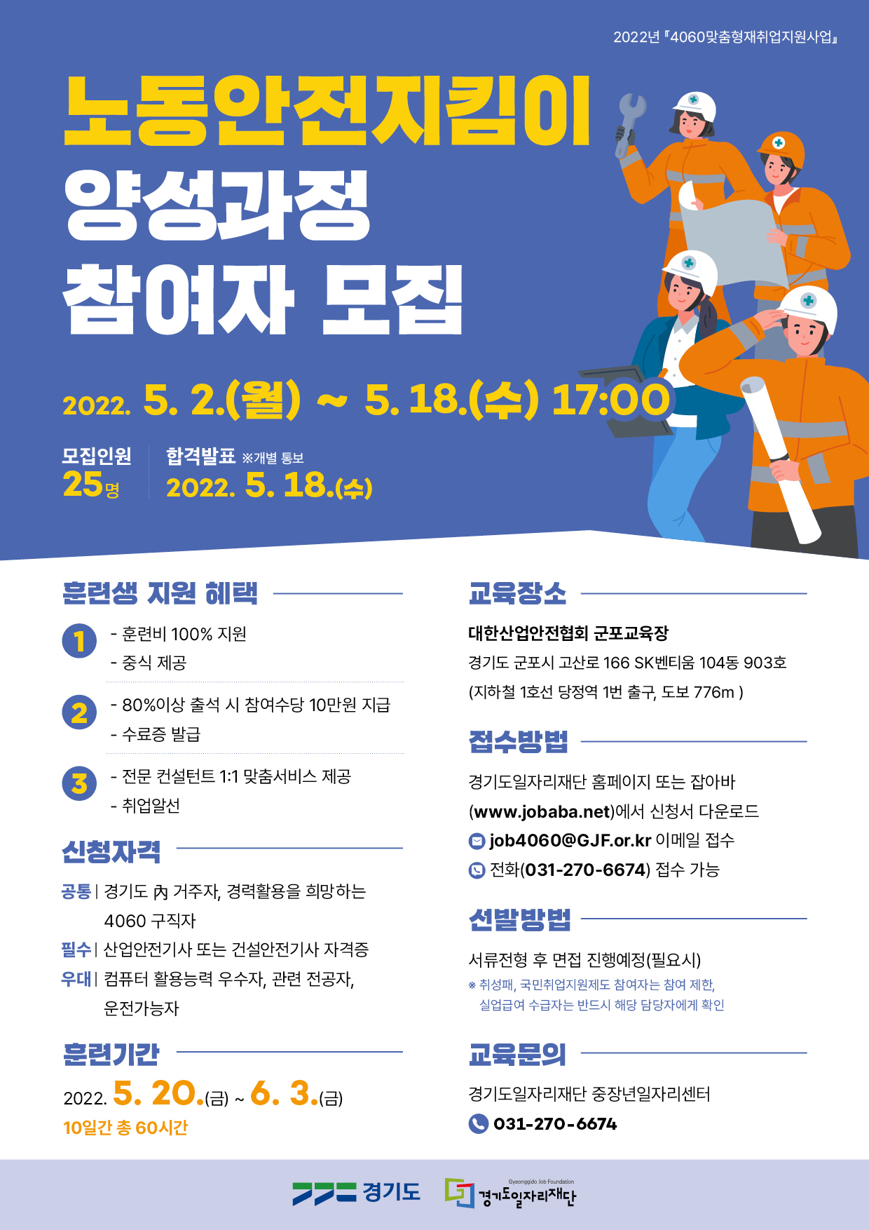 <2022년4060맞춤형재취업지원사업>노동안전지킴이 양성과정 참여자 모집(~5.18.)