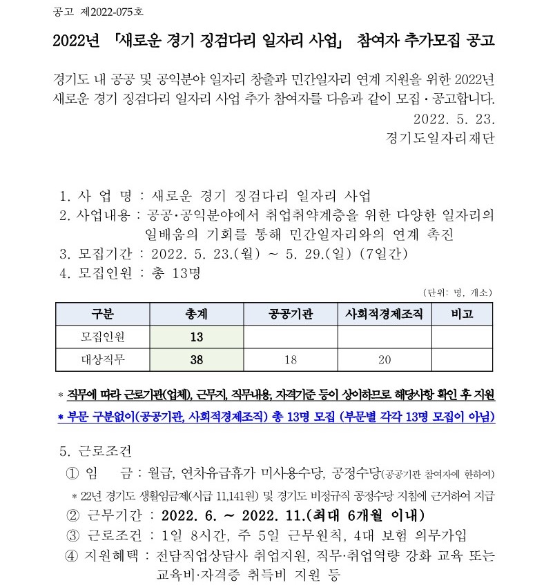 「2022년 새로운 경기 징검다리 일자리 사업」 참여자 추가모집