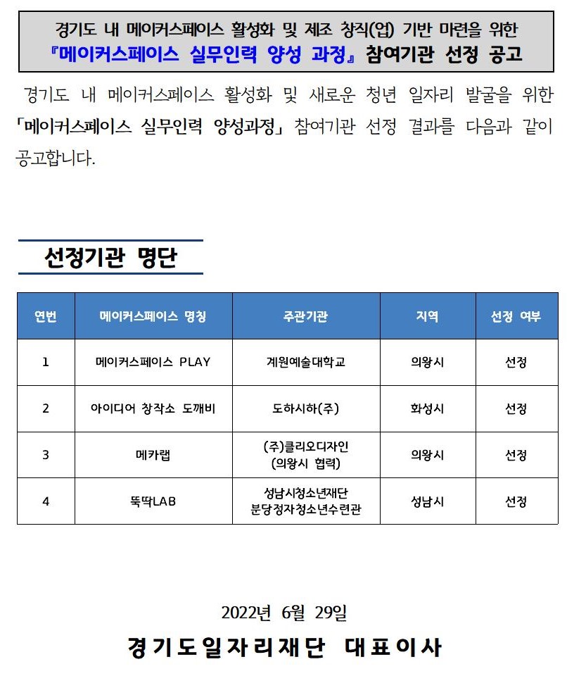『메이커스페이스 실무인력 양성 과정』 참여기관 선정 공고