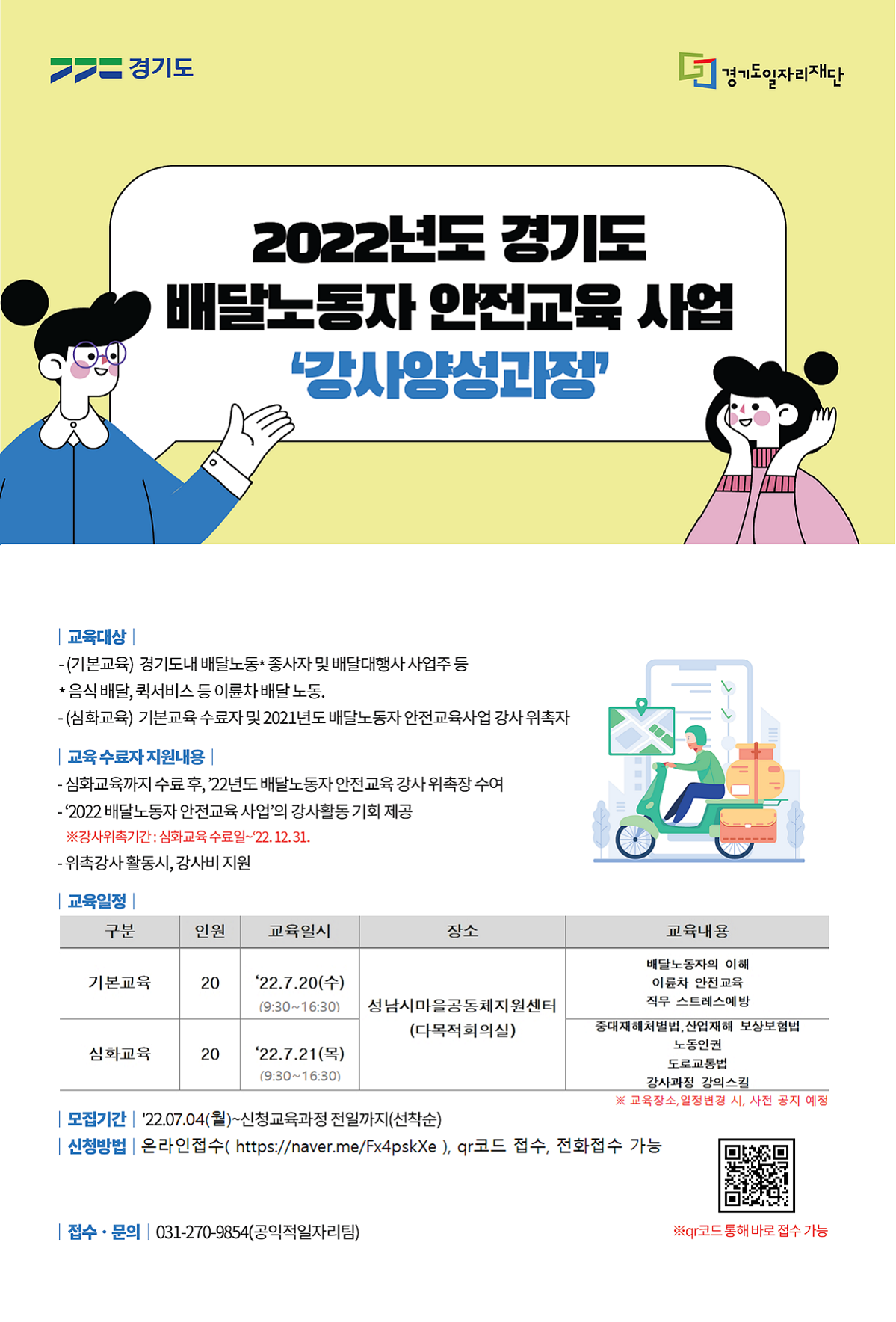 경기도일자리재단에서 '제 3차 배달노동자 안전교육 강사양성과정'을 시행하오니 많은 참여 부탁드립니다.