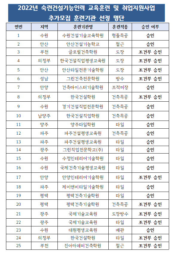 경기도일자리재단 제 2022-127호와 관련하여 숙련건설기능인력 양성사업 민간훈련기관 추가모집 선정결과를 공고합니다.